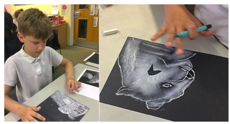 The pupils then created their own pictures using white chalk on a black background. We used black and white photographs of animals as a starting point and the children were encouraged to think about the direction of the light and to identify areas of varying tonal value.