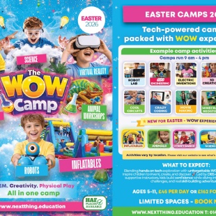 We are excited to run our new WOW Camp at your school this Easter. The camp combines our popular Tech Camp with a range of exciting WOW experiences to create a fun and memorable holiday club for children aged 5–11. WOW Camp is designed to balance learning, creativity, and fun in a welcoming environment where children can make friends, build confidence, and feel proud of what they create.